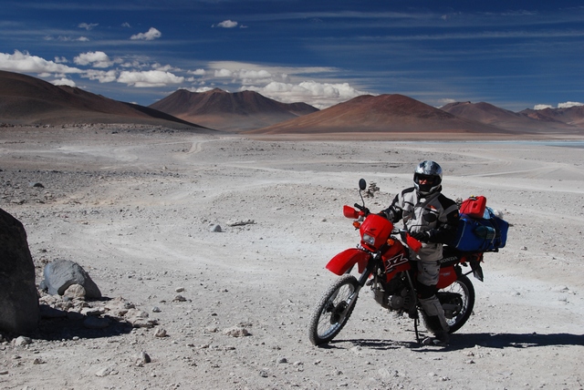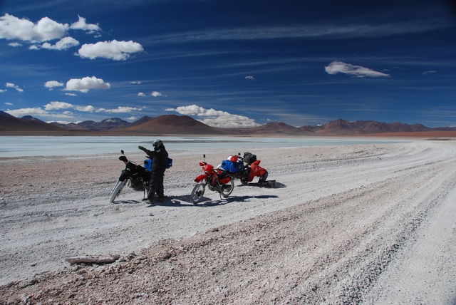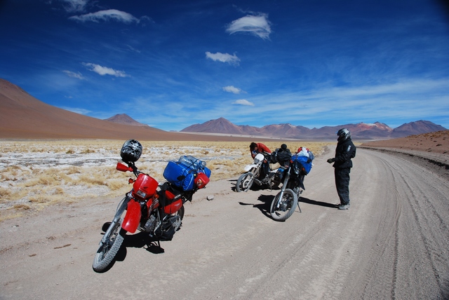 Wyruszamy we troje. Willego poznaliśmy na skwerku w San Pedro de Atacama. Siedział sobie zakurzony, obok motor, więc zagadaliśmy. Podróżuje od 2 lat, za kilka dni chce wjechać do Boliwii. O, ma mapę, a my od dwóch tygodni usiłujemy bezskutecznie kupić mapę Boliwii. Siedzimy, gadamy, czas płynie. Nagle słyszymy jakiś szelest. W czasie naszej rozmowy pewien czarny kundel podkradł się podstępnie do ławki, ściągnął sobie mapę i zaczął ją rozkosznie wyżerać…Efekt: dwie wielkie dziury zamiast La Paz i Santa Cruz…