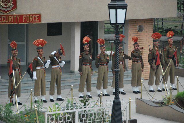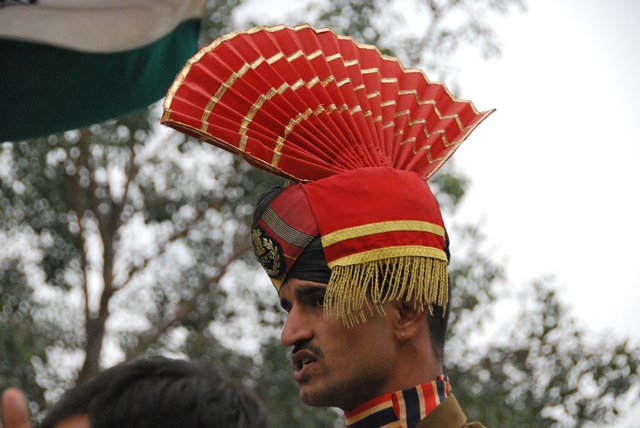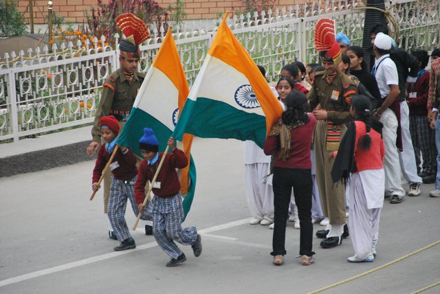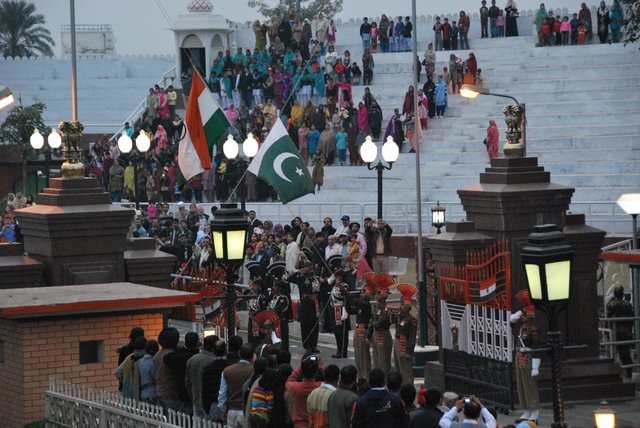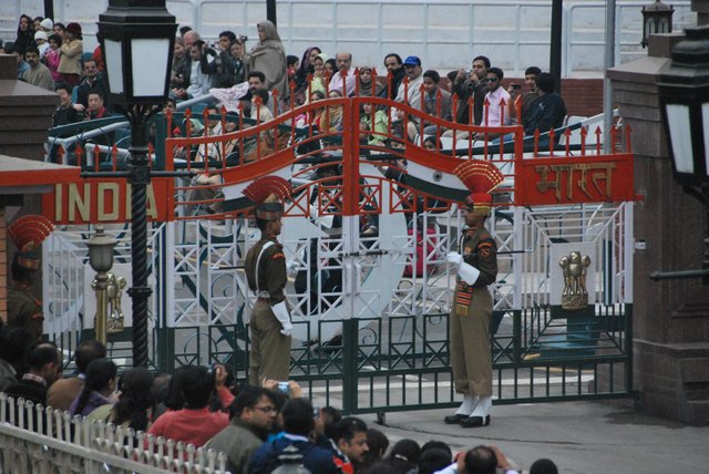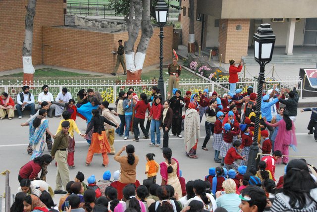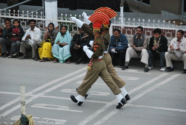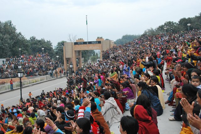 Publiczność, zachęcana przez wodzireja z mikrofonem, klaszcze, wymachuje rękami i wrzeszczy „Hindustan zindabad!”, czyli mniej więcej: „niech żyją Indie!”. Trzeba wydzierać się głośno, żeby zagłuszyć Pakistańczyków po drugiej stronie wykrzykujących „Pakistan zindabad!”.
