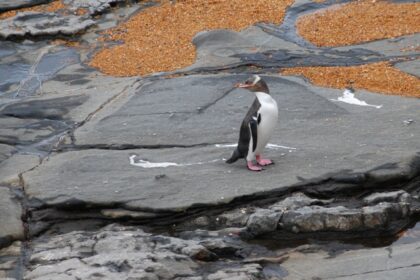 Nareszcie są, nie biorą kasy i blisko podchodzą! PINGWINY!!! Żółtookie!!! Z pingwina najfajniejszy jest skok: staje na kamysiu, czai się, czai, buja, wreszcie wychyla się do przodu i…bęc, ląduje żabką …