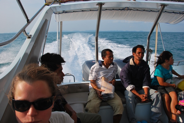 W porcie, na południe od Tratu, przesiadamy się na speedboat’a, który dowiezie nas wreszcie do celu, czyli na maleńką wysepkę Koh Mak. Morze jest wzburzone, motorówka wali o fale, podskakujemy jak na wertepach. Droga do raju nie jest łatwa… Zwłaszcza Mama ledwo żywa, ale dzielna.