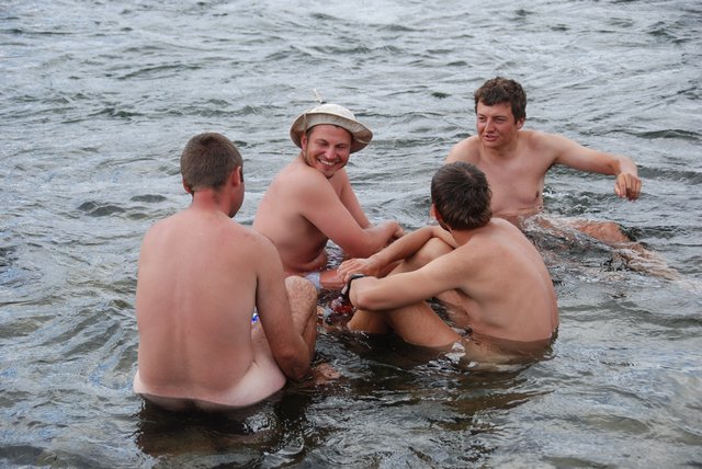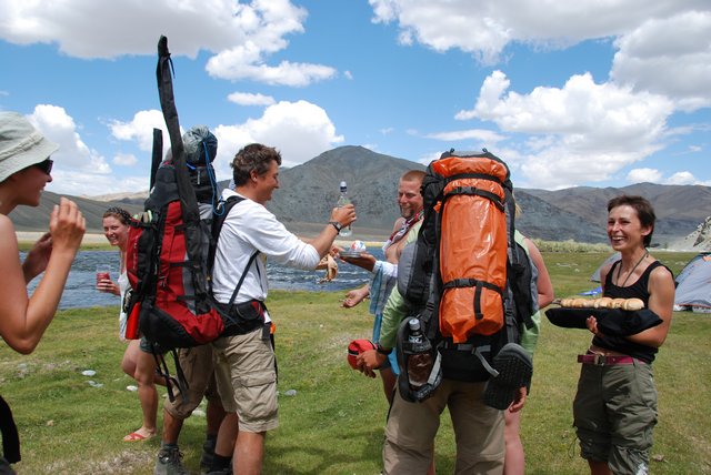 Rano 26 lipca robimy naradę. Podgór chce do żony, więc trzeba coś wykombinować. W końcu ustalamy, że się rozdzielimy: Chewee, Ewa i Podgór będą szli w kierunku, gdzie jest szansa na złapanie transportu, spróbują się dostać do Hoton Nur i poszukać drugiej ekypy. W trzy osoby może coś złapią, na pewno łatwiej, niż w 9 osób. My ruszamy piechotą w kierunku Hoton Nur. Uzgadniamy, gdzie którego dnia będziemy obozować, tak, żeby się spotkać po odnalezieniu drugiej ekypy. Nie ma innego wyjścia, bo telefony nie mają zasięgu, więc to jedyna możliwość, żeby się potem odszukać. Nagle widzimy, że z daleka coś nadjeżdża. Uaz. Podgór rzuca wszystko i leci go zatrzymać. Udało się! Podrzuci Podgóra, Cheewiego i Ewę do Tsengel, a stamtąd złapią coś, co dojedzie do Hoton Nur. Odjeżdżają, a my ruszmy w drogę piechotą. Pierwszego dnia – nic. Dugiego i trzeciego też nie udaje się spotkać. Czwartego dnia (29 lipca) mamy trochę dość chodzenia. Jedzie Ził, załadowany bambetlami, ale łapiemy go. Dowiezie nas do mostu, czyli kolejnego puntu potencjalnego spotkania. Chłopaki jadą na pace z kozą i całą resztą bałaganu, a damy zostają zaproszone do kabiny. Przed mostem wysiadka i widzimy, że na brzegu stoją trzy namioty. Jeden fioletowy..to oni! Ale jakoś tak nie wychodzą nam na spotkanie, hmm, dziwne. Podchodzimy pod same namioty, i dopiero wtedy wyskakuje komitet powitalny z chlebem i solą, a dokładnie bułeczkami, pomidorami, piwem, wódką. Są w komplecie. I przywieźli nowy zapas jedzenia. Radość. Impreza. Okazuje się, że wieczorem tego samego dnia, którego się rozstaliśmy, dotali nad Hoton Nur. Następnego dnia jechali wzdłuż jeziora. Zobaczyli białasów na koniach, pojechali…Wiola padła w objęcia Podgóra, HAPPY END ;-)