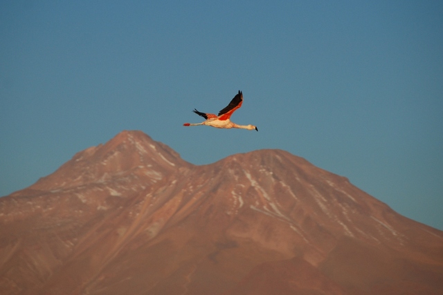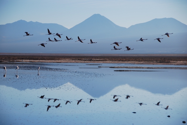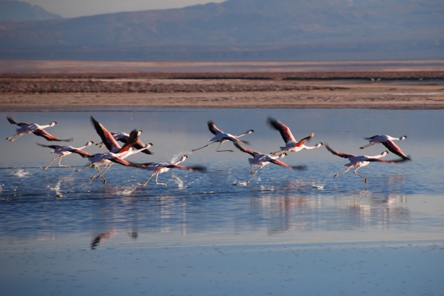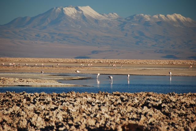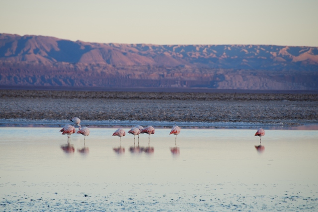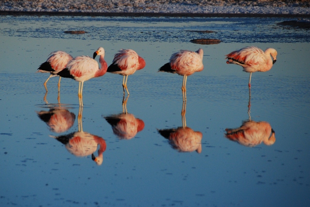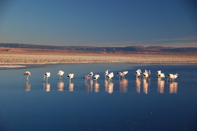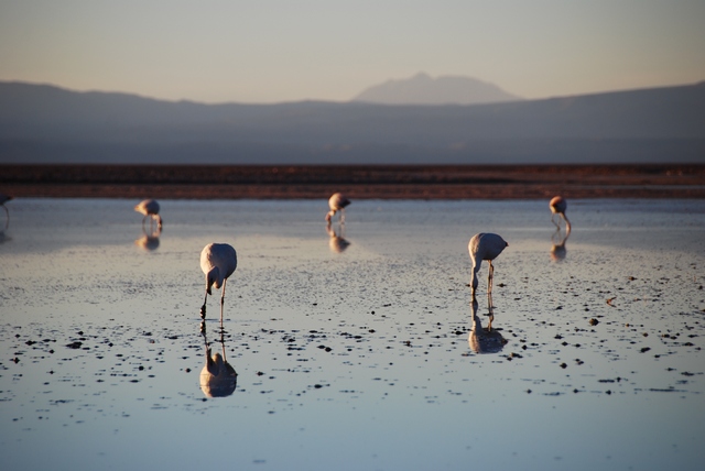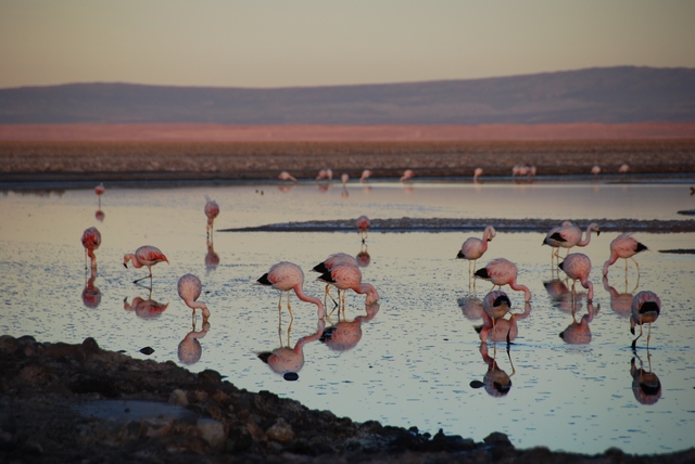 Po południu dojeżdżamy do słonej Laguny Chaxa, gdzie żyją flamingi. Ładnie, i owszem. Ale nagle przed zachodem słońca zaczynają podjeżdżać jeden za drugim autokary, samochody. Na jednego flaminga przypada ze 20 ludzi. Nie lubimy tak…