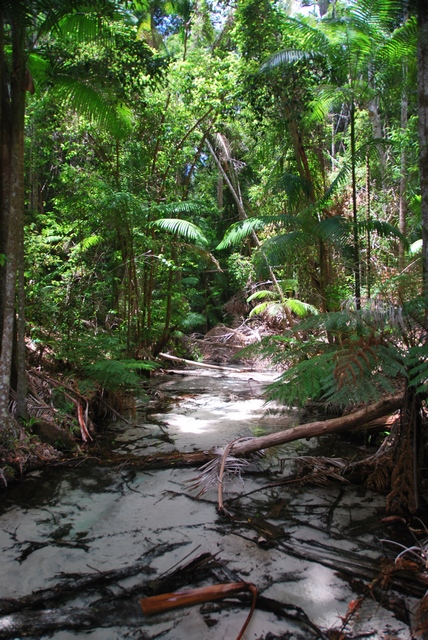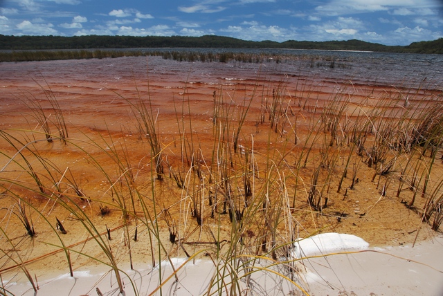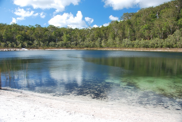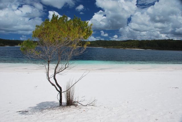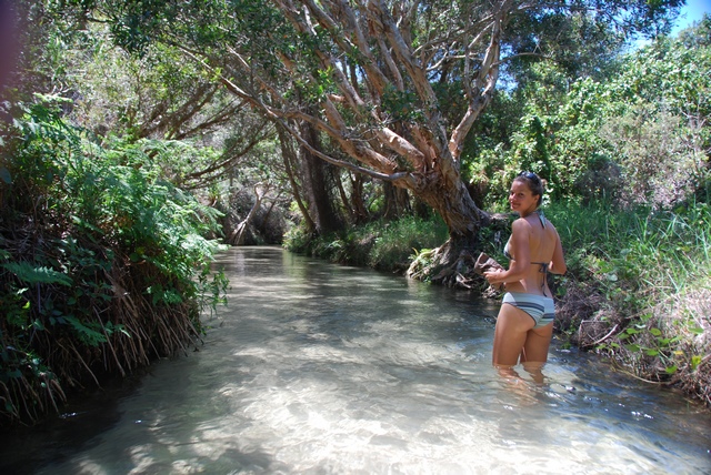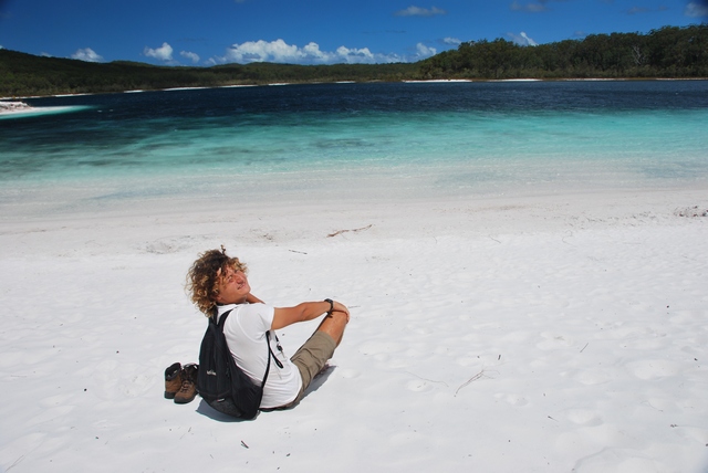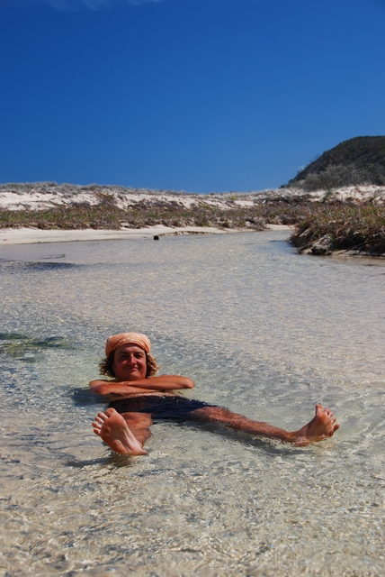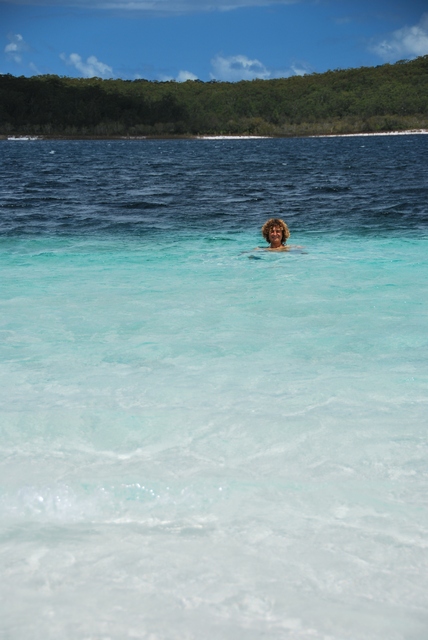 ) pełne ryb, które łowimy sobie z plaży na obiad. Wzdłuż plaży wielkie, piaszczyste wydmy lub skały, z ich szczytu można wypatrzeć w wodzie olbrzymie żółwie czy manty (na prawdę je widać!!!). A wystarczy odjechać kawałek wgłąb lądu, i pojawiają się lasy. To niesamowite, jak na piachu wyrosła prawdziwa puszcza z kilkudziesięciometrowymi drzewami.W pobliżu rzek puszcza przeobraża się w przepiękny las tropikalny, z lianami, palmami…No i przede wszystkim na Fraser Island mnożą się słodkowodne jeziora, w których można do woli pływać (w sumie jest ich ponad 40). Jedne trochę przypominają Mazury albo Bory Tucholskie, inne mają barwę brunatnoczerwoną, jakby rozlała się w nich krew, ale są i takie, co wyglądają jak zatoki na Marszalach, tyle że ze słodką wodą!!! I znowu: tłumek zalega nad najsławniejszym jeziorem McKenzie, inne – tylko dla nas. W kilku mieszkają sobie nawet słodkowodne, małe żółwie. Są również urocze, krystaliczne strumyki z białym, piaszczystym dnem i też doskonale nadają się, żeby w nich zalec dla ochłody.