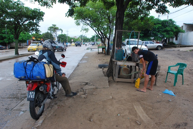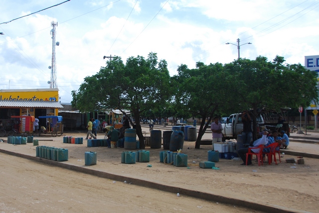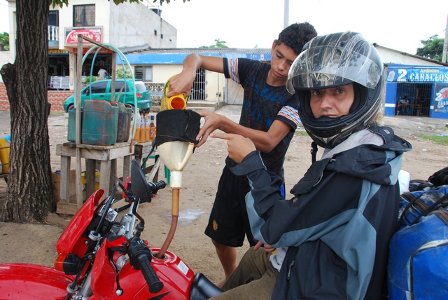 Tu, na wschodzie Kolumbii, niedaleko granicy z Wenezuelą, nikt nie kupuje benzyny na stacjach. Bo i po co, skoro na każdym rogu lokalni „przedsiębiorcy” sprzedają z baniaków tanie paliwo przeszmuglowane z Wenezueli, za które płaci się 4000 pesos za galon, zamiast 8000 pesos? Dla „importerów” to złoty interes, bo w kraju Chaveza benzyna tania jak barszcz, a przy tym i radość dla kierowców Kolumbijskich, którzy płacą tu za gasolinę tyko połowę normalnej ceny. Cóż dopiero powiedzieć o miłym zaskoczeniu dla dwóch polskich turystów ;-).