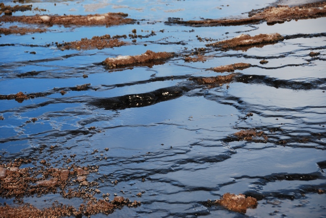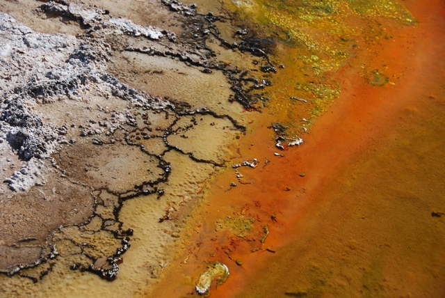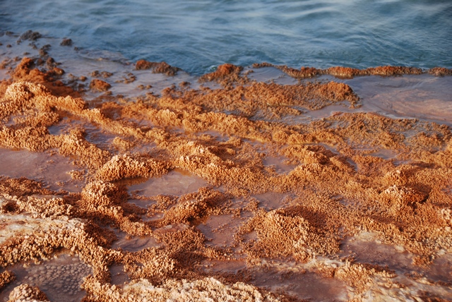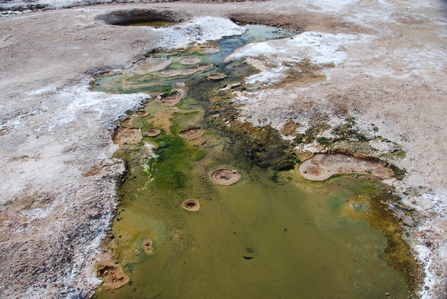 Całe popołudnie łazimy wśród gejzerów. Może o tej porze dnia wybuchy są mniejsze, za to w pełnym słońcu widać fantastyczne kolory. Na koniec idziemy się wykąpać w ciepłym basenie. Kontrolne zanurzenie ręki – o tu będzie dobrze – i hyc do wody. Hmm, no nie do końca. Woda na powierzchni faktycznie gorąca, ale już kilka cm głębiej chłodna. Tylko w niektórych miejscach na chwilę z dna wybija parzący gejzerek, przed którym trzeba uciekać w popłochu, a potem znowu chłodno. Po paru minutach heroicznych prób zmieszania gorącej wody z podwodnego gejzerka i chłodnej z basenu dajemy sobie spokój.