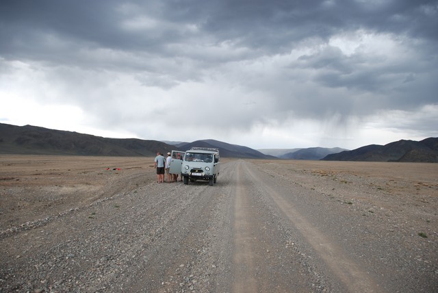 Pobudka 7.00. Pakowanie kąpanie, do wozu się ładowanie. O 10.00 wygląda na to że załoga gotowa jest to wyruszenia. Wszystko idzie gładko i planujemy koło 12.00 sprawnie przekroczyć granice. Nad uroczym jeziorkiem czekamy na przesiadkę do umówionego wcześniej mongolskiego łazika. Dogadujemy się co do ceny i w trasę do Mongolii. Zamiast jednak na granice j edziemy wcześniej na targ i do hurtowni gdzie przedsiębiorczy Mongołowie, którzy widać zbyt mało na nas zarobili, postanawiają wyładować łazika towarami na handel oraz dodatkowymi pasażerami. Robi się ciasno, ale co tam, ważne, że do przodu. Mijają kolejne godziny, wreszcie ruszamy w kierunku granicy. Niebawem okazuje się, ze skręcamy z głównej drogi, bo zdaniem naszego motorniczego do łazika wlezą jeszcze dwie osoby. W sumie stanowimy załogę 16-to osobowa. Na granicy okazuje się, ze jest problem. Mamy o 6 pasażerów za dużo. Każdy zapłacił, więc każdy chce jechać. Przedsiębiorczy Mongoł próbuje zorganizować transport zastępczy, następnie pyta, czy 4 osoby z naszej załogi mogą jechać następnego dnia. Hmmm… Używając rożnych argumentów przekonujemy pana i ostatecznie nasza załoga jedzie cala, a pozostali mongolscy pasazerowie zostają na granicy. Jeszcze tylko demonstracje siły przez rosyjskich urzędników, tak żeby jasne dla nas było, że opuszczamy wielkie imperium. Kończy się asfalt, zaczynają jurty, kozy, jaki, konie. Tak, jesteśmy w Mongolii!!!