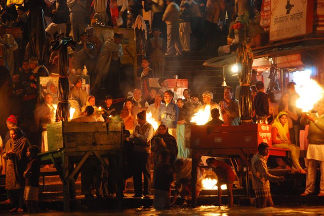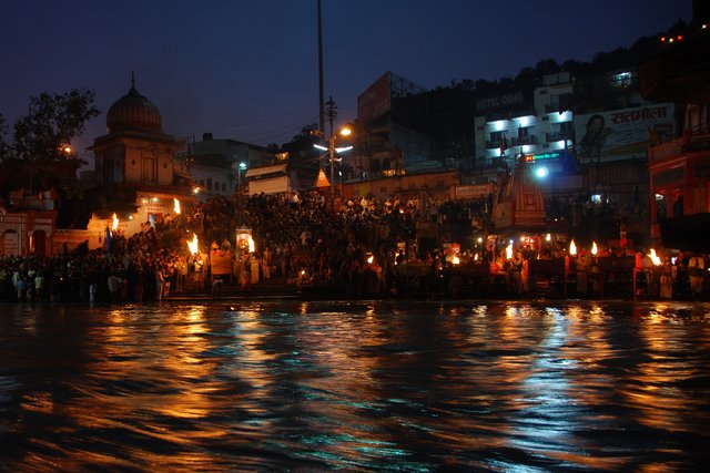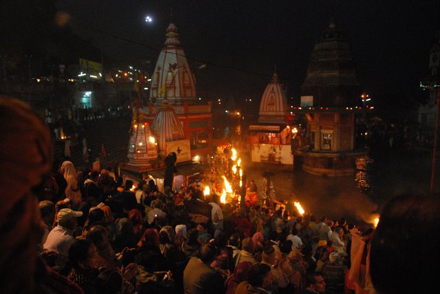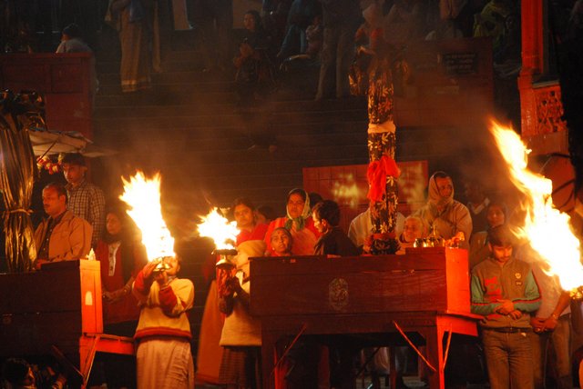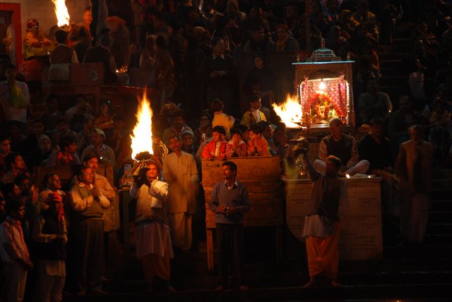 Po zachodzie słońca zaczyna się ceremonia ganga aarti. Na brzeg Gangesu zostają wystawione posągi bogów, rozbrzmiewają śpiewy, rozpalają pochodnie. Ludzie puszczają na wodę splecione z liści koszyczki, rodzaj święconki, w której umieszczają kwiaty, odrobinę jedzenia i płonącą świeczkę.