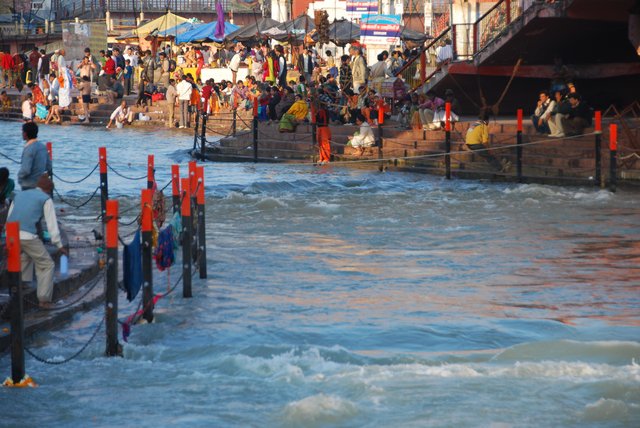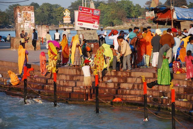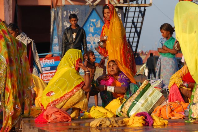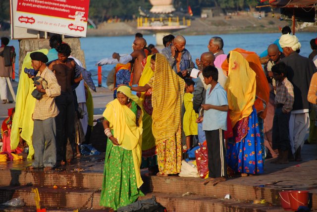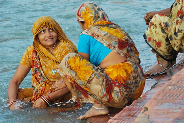 Najpierw, jeszcze przed zachodem słońca, ludzie wchodzą do wody. Prąd jest bardzo silny, więc muszą trzymać się przyczepionych do brzegu łańcuchów, żeby nie odpłynąć. Kobiety wchodzą do wody w swoich kolorowych sari, rozpuszczają włosy. Zanurzają się razem z głową.