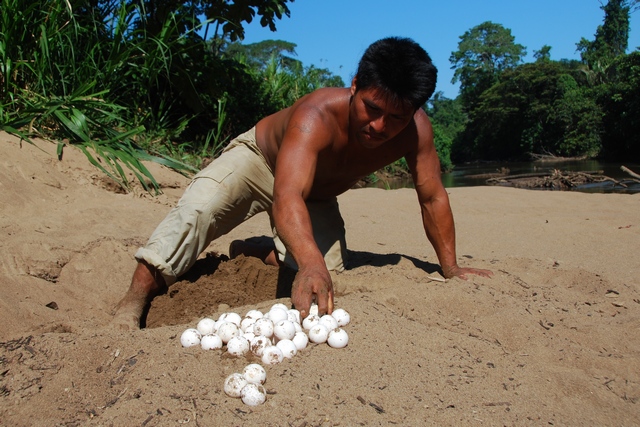 – A, to są jaja żółwi na nasz obiad – wyjaśnia Otobo – Pyszna tortilla będzie, zobaczycie! W selwie z głodu nie zginiecie…