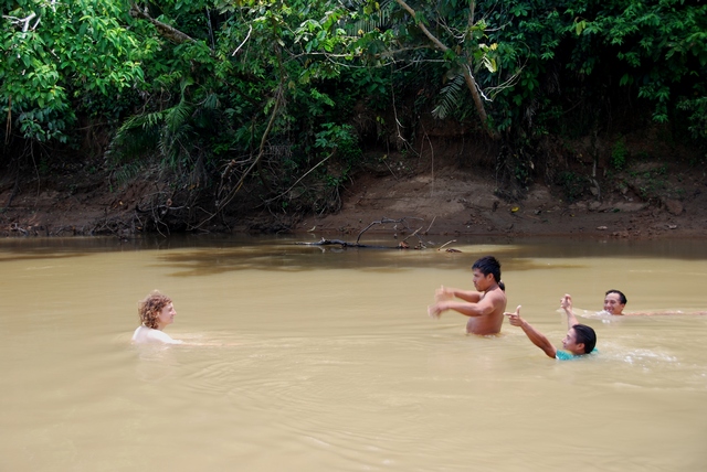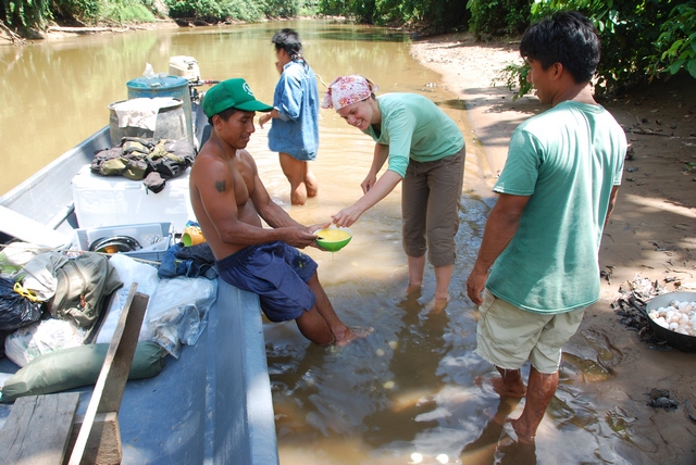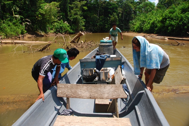 Zaczynamy wyjaśniać, o co nam chodzi. Manuel okazuje się szefem wioski położonej poza rezerwatem, jakieś dwie godziny łodzią od mostu. Hmm, kiedy my chcielibyśmy nieco dalej… Po chwili pojawia się facet o imieniu Otobo, mieszkający w samym sercu rezerwatu Yasuni, wiosce Bameno, gotowy zabrać nas głębiej. Negocjujemy cenę. Tłumaczymy, że chcemy przez parę dni pomieszkać z nimi, jeść i robić to, co oni. Okazuje się, że chłopaki i tak muszą przewieść towar do Bameno, więc płacimy im za benzynę. Dzięki nam zwróci im się kurs.