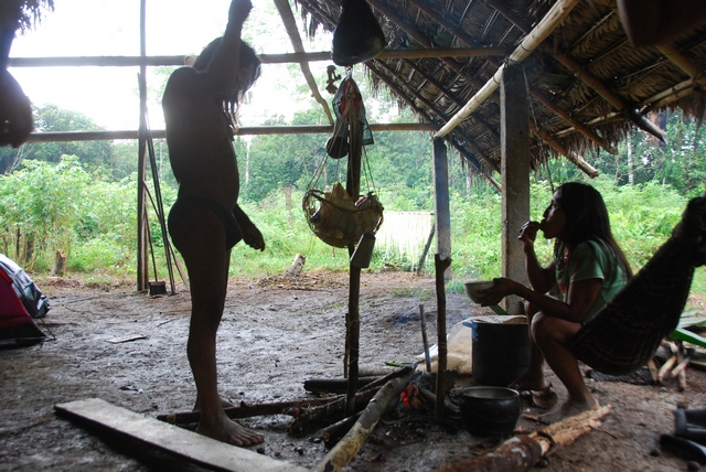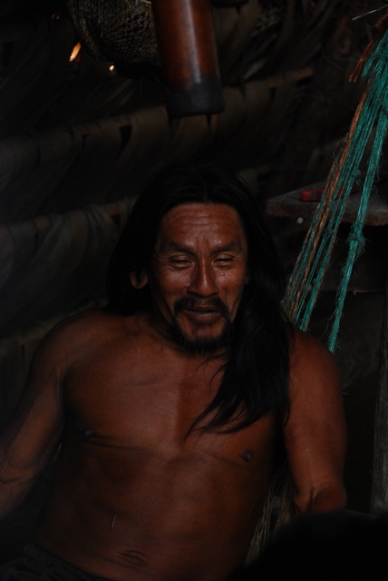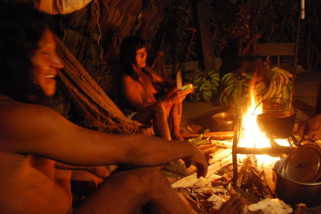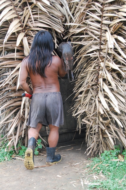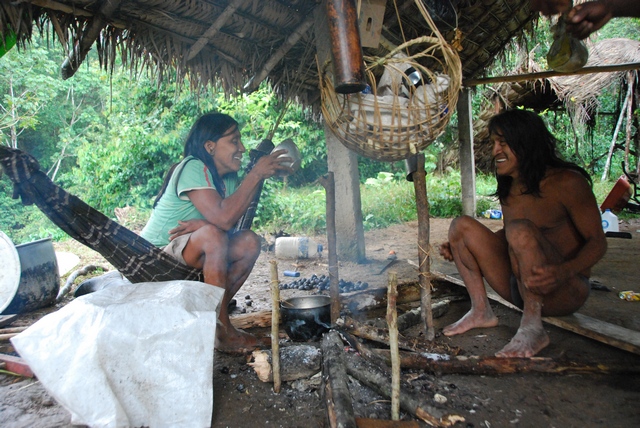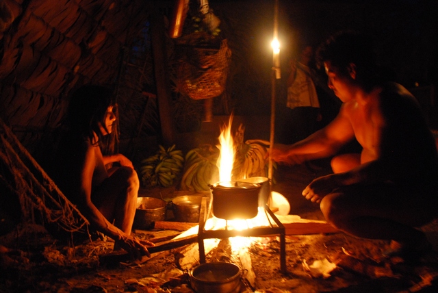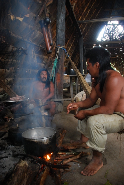 Śpią w drewnianych podwyższonych domkach, ale większość dnia przebywają w olbrzymim szałasie, służącym za kuchnię i świetlicę. W jednym rogu szałasu stoi telewizor, w drugim płonie palenisko. Nad ogniem wędzi się mięso: głowa dzikiej świni, małpa i żółw. Jedzenie nie przyjeżdża z miasta. Sami hodują jukę, platany, banany i polują. Co chwilę popijają chucurę, czyli wodę z rozgniecionym bananem. Ojciec Otobo przez cały czas śmieje się i opowiada o czymś w języku Huarani, nawija też do nas, i chociaż nie rozumiemy ni w ząb o czym, emanuje tak pozytywną energią, że słucha się go jak muzyki.