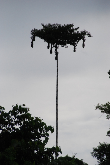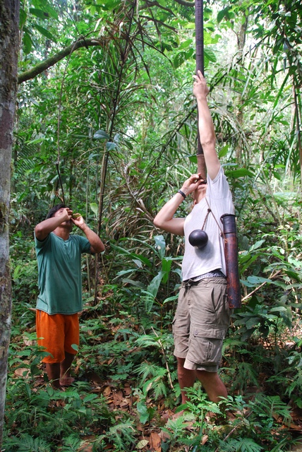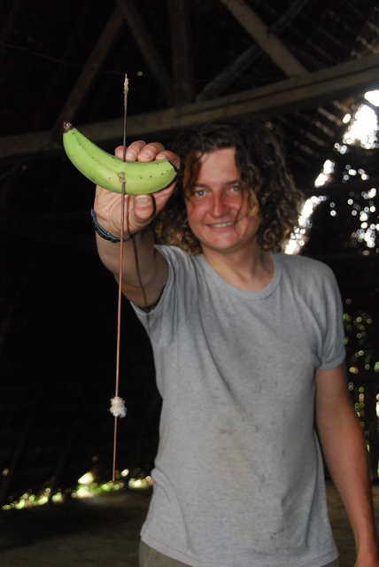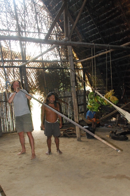Próbujemy strzelać. Ledwo możemy utrzymać kilkumetrową rurę. Wkładamy do środa strzałkę nasączoną currarą na jednym końcu i bawełnianą owijką z drugiej i dmuchamy…do banana. Pudło, pudło, pudło….i bingo! Do zabicia człowieka potrzeba „aż” trzech takich strzałek, na małpę wystarczy jedna.