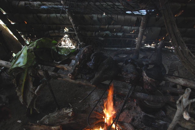 Pora wracać. Dziś na noc zatrzymamy się u rodziców Otobo. A tu przed szałasem podekscytowany ojciec wykrzykuje, gestykuluje i pokazuje nam kępkę sierści jakiegoś zwierzaka.