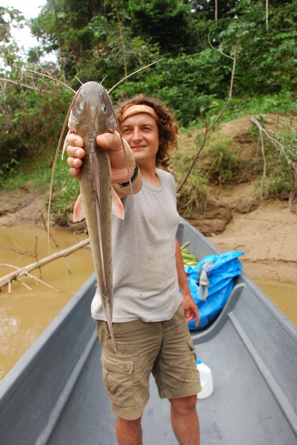 – To teraz jeszcze rybkę sobie złapiemy – zakładają na haczyk jedno z żółwich jajek. Jajko ma miękką, elastyczną skorupkę i nie pęka po wbiciu w nie haczyka. Po kilku sekundach wyciąga z wody pokaźnego suma. -W selwie z głodu nie zginiecie… – przypomina nam Otobo.