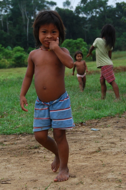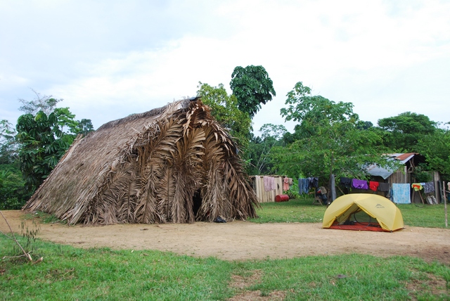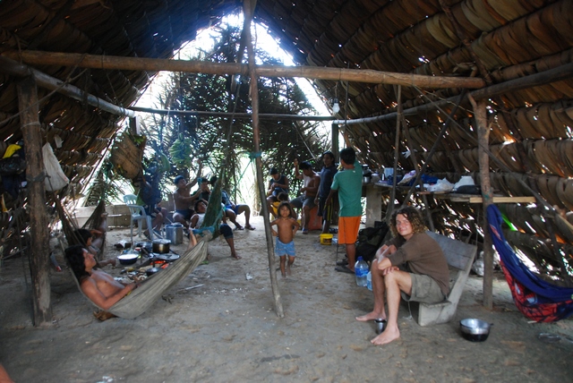 Znowu na łódkę. Wieczorem dopływamy do celu podróży – wioski Bameno. Na nasz widok większość nagich kobiet zakłada koszulki…Znowu szałas, ognisko, popijanie chucury. Szałasy wyglądają wprawdzie ubogo i prymitywnie, ale Huarani zaskoczyli nas swoją higieną. Kąpią się kilka razy dziennie w strumykach albo nagromadzonej deszczówce, nie ma żadnego „zapaszku”. Niejeden gringo mógłby brać przykład.