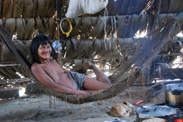 Dobijamy do osady. Tu mieszkają rodzice Otobo. Bogato u nich. Mają dwa silniki do łodzi, generator. Powoli się wszystko wyjaśnia. Otóż Otobo jakiś czas temu połapał się, że na białasach można nieźle zarobić. Kilka razy w roku mała awionetka przywozi do selwy grupę bogatych amerykańskich turystów i odstawiają dla nich szoł: malują twarze, zawijają fiutki w tasiemki, zakładają korale, serwują owocowe drinki z mineralnej wody i grillują kurczaki – istny Disnayland. Taka przyjemność kosztuje 200 dolarów od osoby za dzień. A że właśnie w grudniu ma jedna grupa przyjechać, to bracia zwożą do wioski paliwo i inne artykuły, żeby ich obsłużyć. Ale ponieważ my nie zapłaciliśmy zbyt wiele, więc dla nas nie ma przedstawienia. I dobrze, o to chodziło. Dzięki temu możemy zobaczyć, jak sobie faktycznie na co dzień żyją.