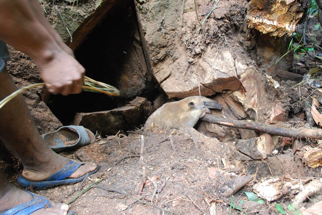 Nie wiemy o co chodzi ale lecimy za nimi do lasu. Oto co się stało: pies pogonił za zwierzakami, które uciekając niechcący schowały się do tej samej dziupli. Mrówkojad i jakiś duży gryzoń. Dochodzimy do dziupli. Chłopaki piłą i siekierą próbują dostać się do środka. Nie jest łatwo. Wreszcie wkładają rękę i wyciąga z niej przerażonego, wyrywającego się mrówkojada. Mrówkojad ma szczęście: jest niesmaczny. Puszczają go wolno. Teraz kolej na gryzonia. Znowu dłubią w dziupli, ciągną – jest drugi stwór. Zanim się zdążyliśmy zorientować dostaje maczetą w łeb.