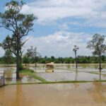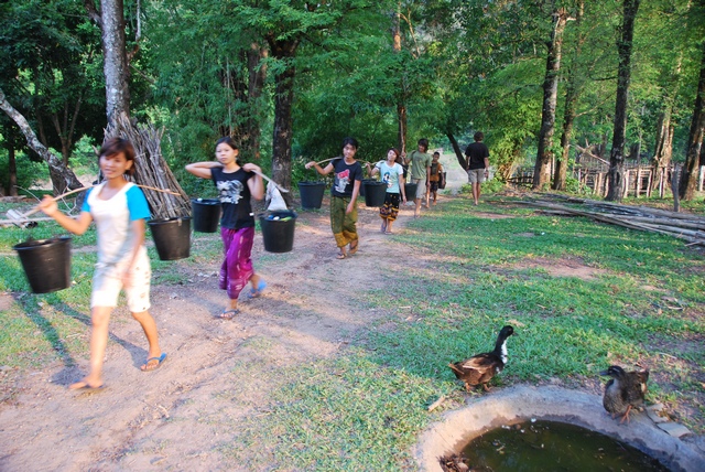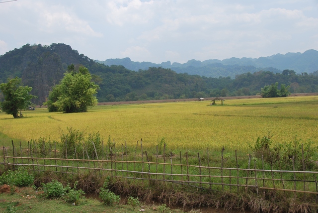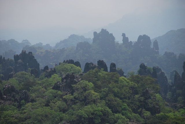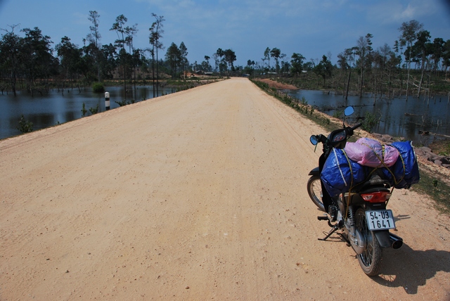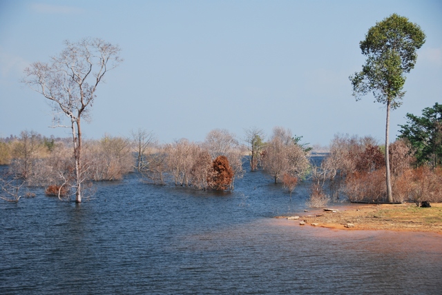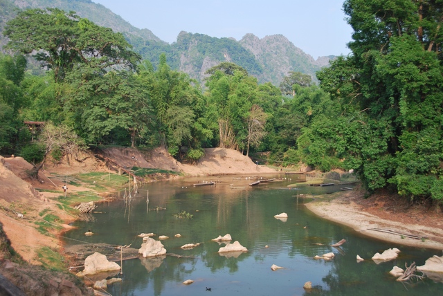 Na pierwszy nocleg zatrzymujemy się w Thakhek, ładnym postklonialnym miasteczku, pełnym starych, francuskich budynków. Z Thakheku odbijamy na północny wschód, w góry. Miała być fajna droga przez rainforest, ale niestety, spóźniliśmy się. Postawili tamę, zalali większość doliny, budują nową drogę. Z wody wystają już tylko zdychające kikuty drzew.