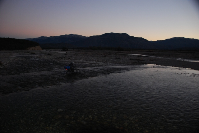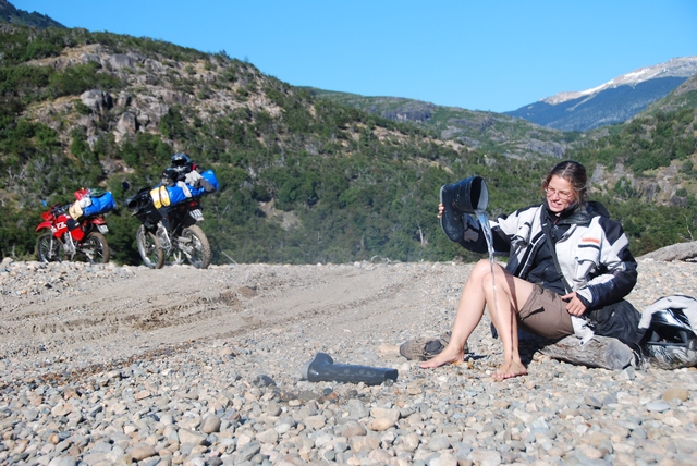 Do campingu zostało 8 km. Tylko niestety droga się skończyła. Wjechała do rzeki. Dość szerokiej, głębokiej po kolana. Zakładamy kaloszki i się przeprawiamy. Poszło jakoś.