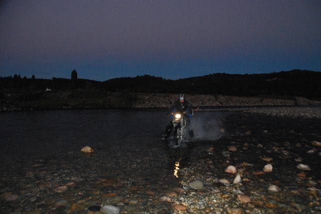 Za rzeką niestety droga kompletnie rozmyta. Kamienie i głębokie błotniste kałuże. Zaczęło się robić ciemno. Przed nami kolejna olbrzymia kałuża. Bartek próbuje przejechać…coraz głębiej…i głębiej…cholera wydech pod powierzchnią…woda w kaloszach. Jesteśmy przemoczeni, ale udało się. Coś jednak nie możemy po ciemku znaleźć tego ośrodka. W końcu niechcący trafiamy do budki pograniczników. Pytamy, gdzie jest ośrodek. Nieczynny. Jesteśmy ledwo żywi, przemoczeni i zmarznięci. Pogranicznicy pozwalają nam rozbić namiot na polu za ich strażnicą.