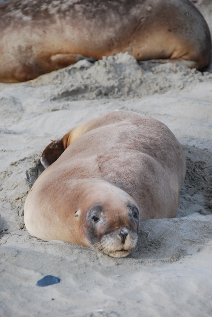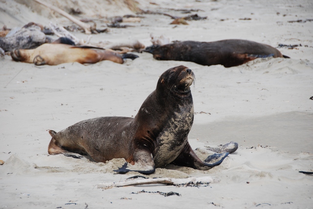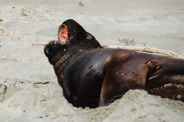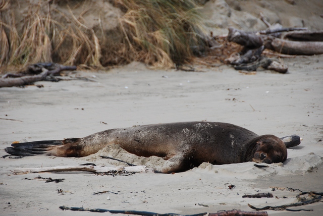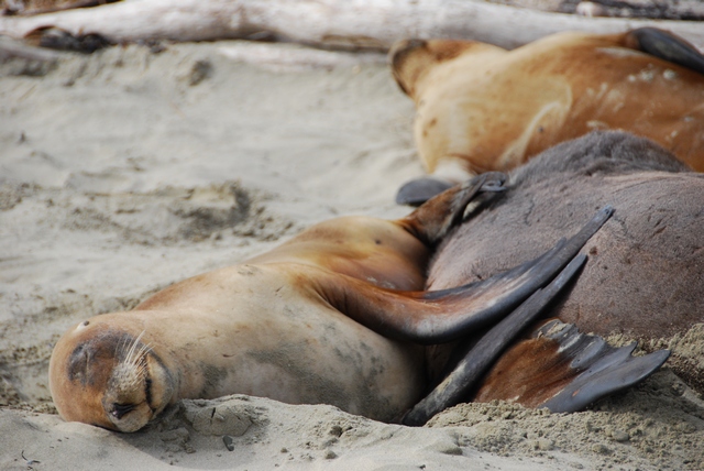 Spacerujemy plażą. Pod wydmą leży kłoda. Podchodzimy bliżej…to nie kłoda, to zdechła foka. Po głowie łażą jej muchy. Stoimy i się gapimy, aż tu znienacka zwierze szeroko ziewnęło. To nie zdechła foka, tylko całkiem żywy lew morski, okupujący wraz z grupą kumpli kilka kilometrów plaży. Śpią, tarzają się w piachu, czasem zaryczą i przede wszystkim śmierdzą.