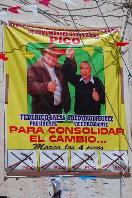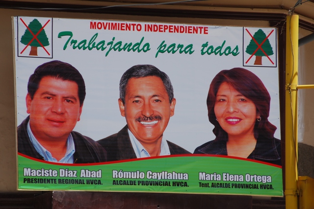 W Peru zbliżają się wybory samorządowe. Bije się Kartofelek, Lama, Kilof, Rączka i Drzewko…I różne inne dziwolągi, w zależności od okręgu. Po wsiach ciagle wielu ludzi jest analfabetami, więc jakoś trzeba było ułatwić im głosowanie. Ulicami miasteczek jeżdżą samochody puszczając na cały regulator piosenki wyborcze ułożone na cześć kandydatów. Marka la papa!!!