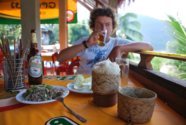 (sałatka mięsna, sticky rice i Beerlao – laotański zestaw obowiązkowy)