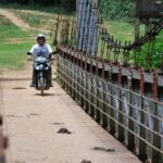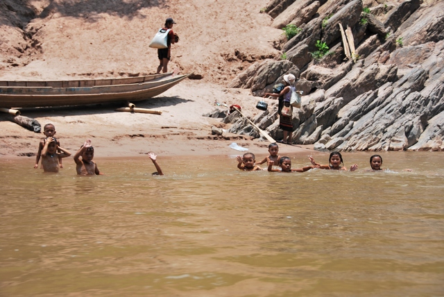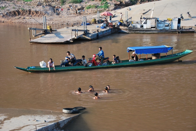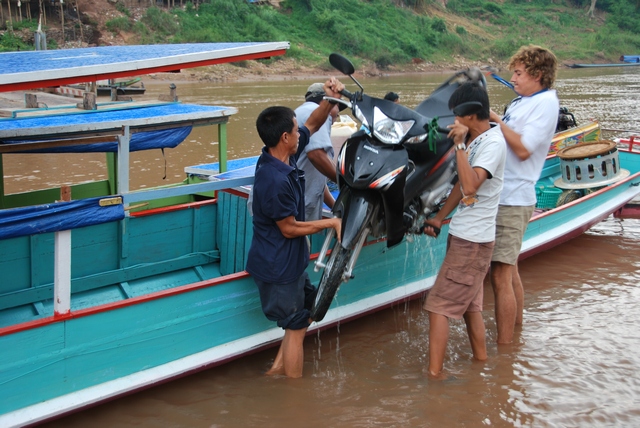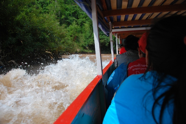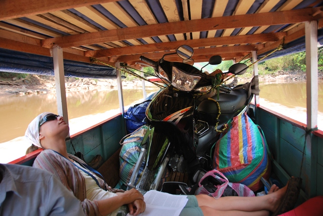 Kolejnego dnia poputaliśy nieco drogę – przegapiliśmy skręt i zamiast jechać na północ zaczęliśmy zbliżać się do wietnamskiej granicy. Żeby nie wracać tą samą drogą decydujemy się na transport rzeczny. Pakujemy się do łodzi z motorami i upchnięci pomiędzy lokalesów płyniemy sobie. Bo ile w końcu można jeździć?