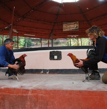 Zatrzymujemy się w górskiej wiosce na obiad. Na środku knajpy scena, pewnie potańcówki tu urządzają w weekendy. Na ścianach gablotki. Za szybą puchary, medale, zdjęcia kogutów… To nie scena do …