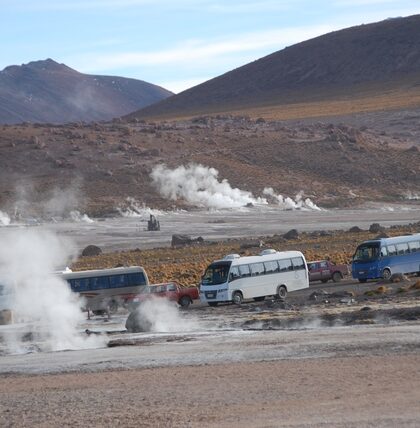Przed wyjazdem z gejzerów El Tatio stara Indianka – strażniczka pyta nas, jak nam się podobało. Fajnie, tylko woda w basenie za zimna. A, jak chcecie ciepłą wodę, to dalej, …