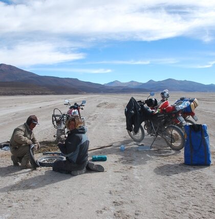 Wreszcie kończą się wertepy i zaczyna się słynny Salar Uyuni… Przy wjeździe na Salar siedzi Boliwijczyk i dłubie w swojej Jawie. Podjeżdżamy sprawdzić, co się stało. Guma. Spełniamy dobry uczynek, …