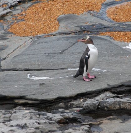 Nareszcie są, nie biorą kasy i blisko podchodzą! PINGWINY!!! Żółtookie!!! Z pingwina najfajniejszy jest skok: staje na kamysiu, czai się, czai, buja, wreszcie wychyla się do przodu i…bęc, ląduje żabką …