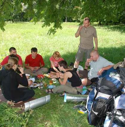 Czas relaksu po męczącej podróży. Miejsce urocze, nad przełomem rzeczki. Upał, ale z wiaterkiem. Cudownie jest, cudownie…Chłopaki od rana próbują zapewnić świezą rybkę na kolację. Coś jednak słabo bierze…No nic, …