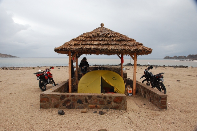 Wokoło pusto. Sezon się skończył. Na plażowym kempingu jesteśmy sami. Tylko co tu robią te chmury??? Zagaduję strażnika kempingu, czy myśli, że będzie dziś padało. Patrzy na mnie jakbym spytała go, czy spodziewa się tu dziś lądowania UFO, śmieje się i przecząco kręci głową.