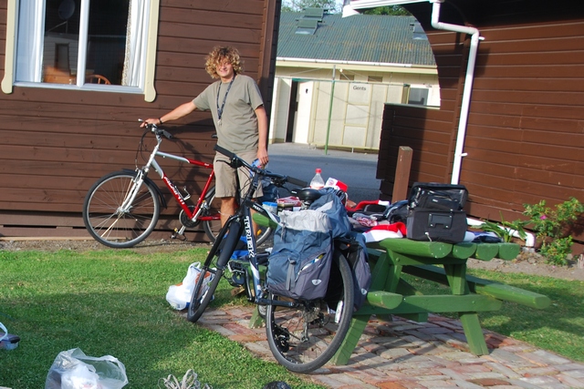 Można jechać. Zaopatrujemy się w książeczkę pt. „Peddalers Paradise” – bardzo pomocna mała cienka broszura opisująca zwięźle i szczegółowo wszystkie ważniejsze trasy rowerowe w NZ wraz z profilami przewyższeń. Obowiązkowa rzecz do jazdy w NZ, gorąco polecamy. Odchudzamy bagaż i zostawiamy plecaki w recepcji kempingu (odbierzemy za miesiąc – dwa). Pakujemy sakwy, zakładamy obowiązkowe kaski nadające całemu przedsięwzięciu profesjonalnego wyglądu, naciągamy lycre`y ;-))) i zaczynamy przeprawę…