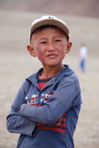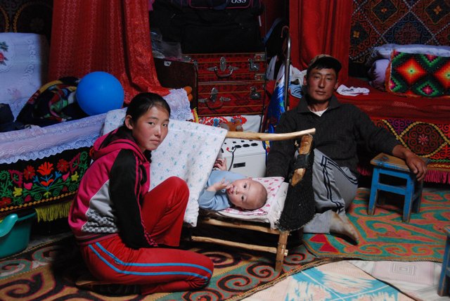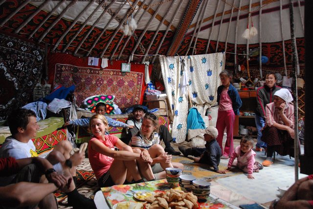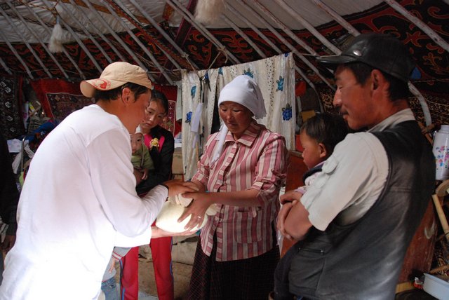 Od rana zapychamy po górach, chłopaki zabrali najcięższe manele Podgóra, więc daje radę iść. Wreszcie schodzimy do doliny. Przed nami wyrastają jurty. Zaczyna padać, więc zapraszają nas do środka. Wjeżdża poczęstunek: sutej czaj (herbata z solą i masłem z jaka, o dziwo dobre), kyrt (twarde, kwaskowe serowe kulki – powiedzmy dla smakoszy), borcuk (smażone pierożki, czerstwawe), żółty ser, cukierki. Jurta jest obszerna, trudno uwierzyć, ile narodu może się w niej zmieścić. Weszła nasza dziewiątka, gospodarzy gdzieś pięcioro plus chmara bachorków i jest dużo miejsca. Ponoć mongolskie jurty są mniejsze, a ta jest kazachska. Bogata rodzinka, w kącie nawet wypatrzeliśmy kamerę. Mamy szczęście, mówią po rosyjsku, więc jest szansa na coś więcej niż tylko kiwanie głowami i głupkowate uśmiechy. Gospodarz jest zachwycony Jacka lornetką, chce ją koniecznie kupić. Niestety, nie da rady, bo to prezent-pamiątka. Bardzo go to zmartwiło, bo przez taką fajną lornetkę mógłby wypatrywać swoje bydło. Ale Chewbacca i Ewa zabrali monokla, do którego nie są tak przywiązani, więc postanawiamy ubić interes: wymienimy monokla za ser. Machnioim? Zgoda. Monokl przechodzi na wyposarzenie jurty, a my dostajermy wielką bryłę jeszcze ciepłego, białego sera, takiego jakby zakopiańskiego buncu. Wieczorem ucztujemy. Pychota, dobry biznes!