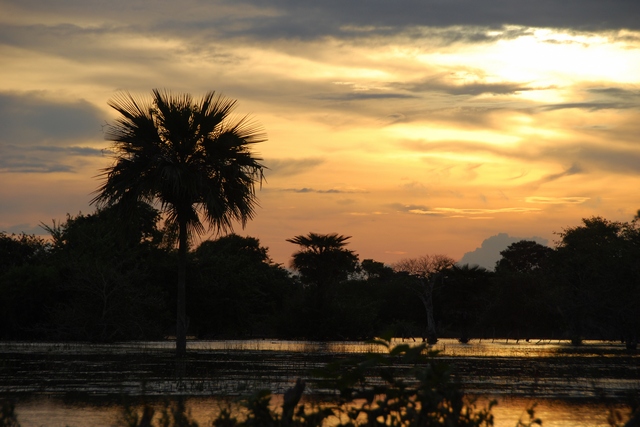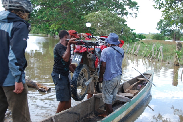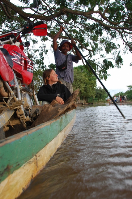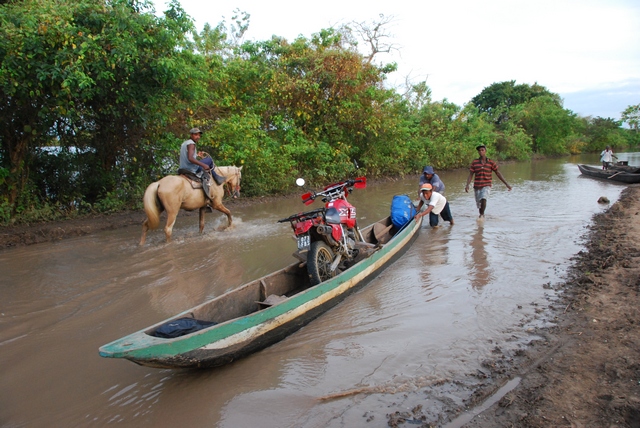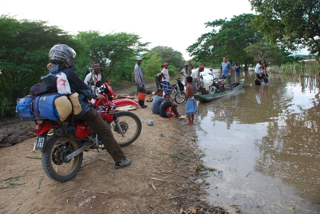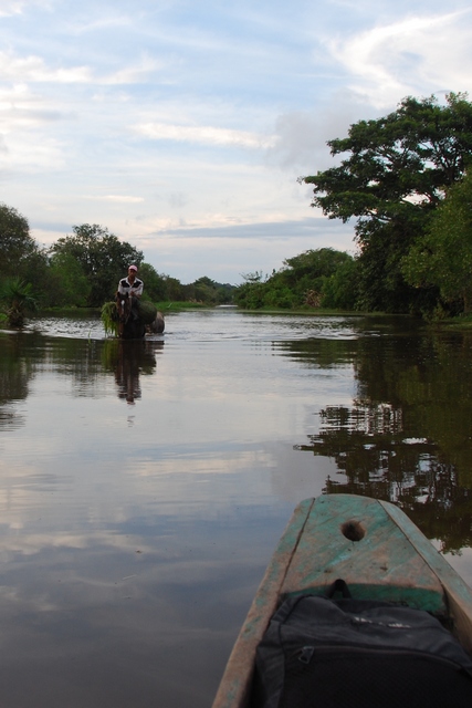 Zaryzykujemy szutrówkami. Padało tu mocno ostatnimi czasy, wszędzie dużo kałuż i błota, nie jest łatwo ale w sumie przejezdnie. Nagle jednak droga wjeżdża do jeziora… Przed nami wielkie powodziowe rozlewisko…Na brzegu przy malutkich drewnianych czółnach uwijają się ludzie – raz dwa trzy i zanim się spostrzegliśmy, motor już był zalogowany na łódce, a my obok. Powoli zachodzi słońce, dokoła cisza, piękny widok… Nasz łódkowy się tylko dziwi, że my tak spokojnie w czółnie siedzimy, bo on kiedyś już wiózł gringo i oni strasznie piszczeli, że zaraz wpadną do wody…![]()