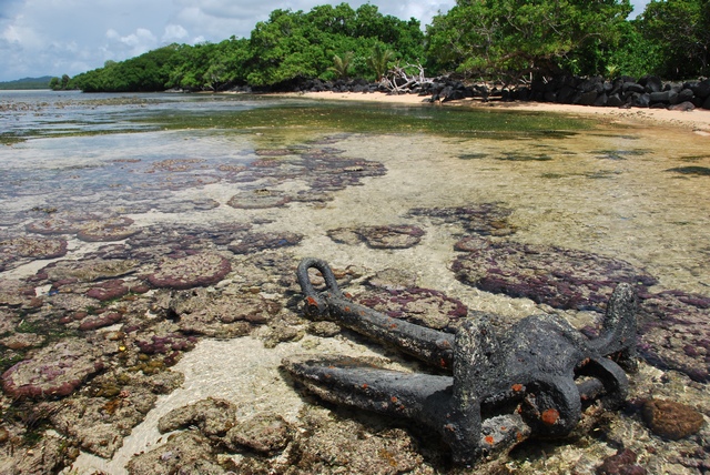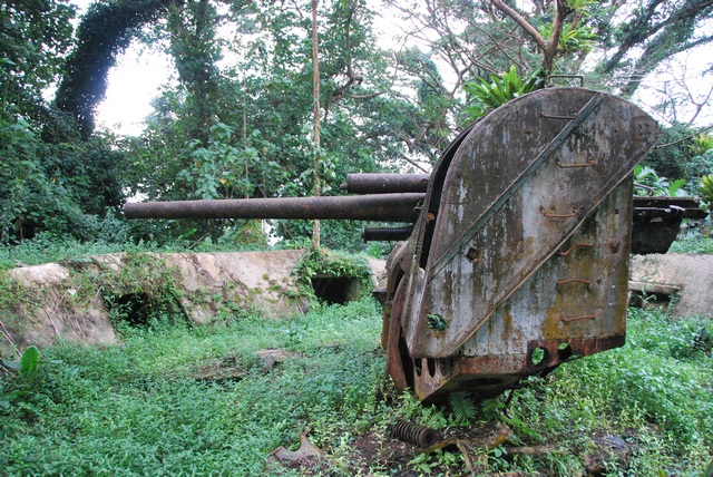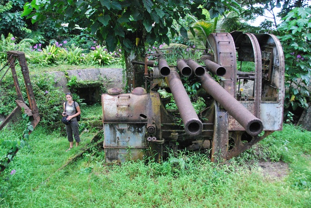 Po wyspie porozrzucane są wojenne pozostałości: a to czołg, a to działo zarośnięte krzakami…
