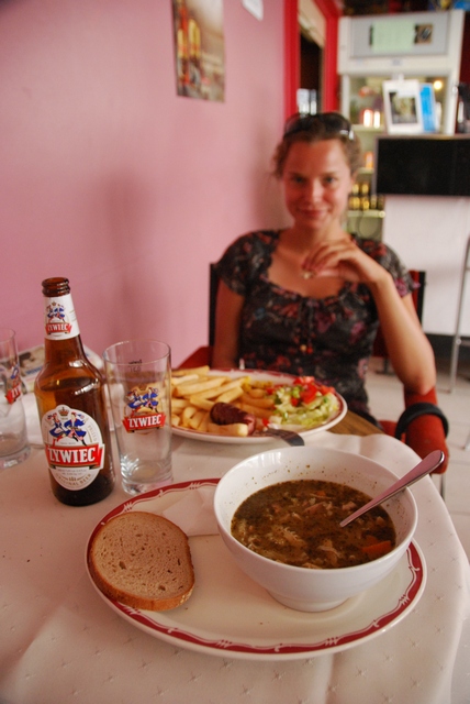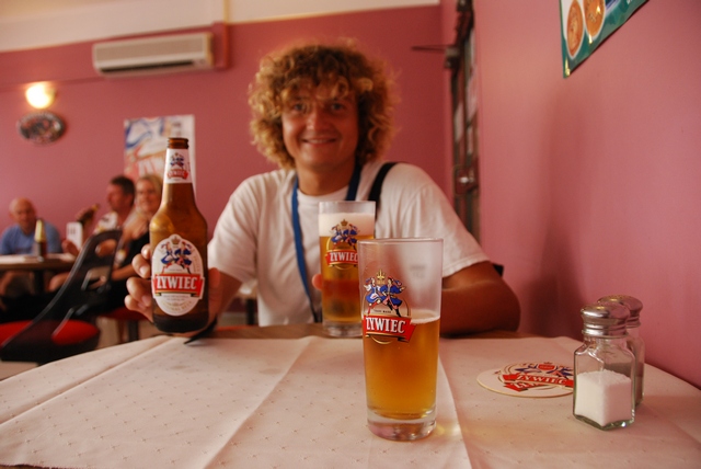 Jedziemy. Na półeczce leżą książki „do wzięcia”, więc sobie biorę, a tymczasem Bartek drze się: „Marta, Marta, choć tu, szybko, popatrz!!!” Idę, patrzę, oczom nie wierzę, bo w sąsiedniej sali mają bar, a w barze Żywca! I swojskie menu! Zamawiamy flaki, kiełbasę z rusztu, po kufelku piwa i plotkujemy sobie po polsku z miłymi Paniami z Klubu….