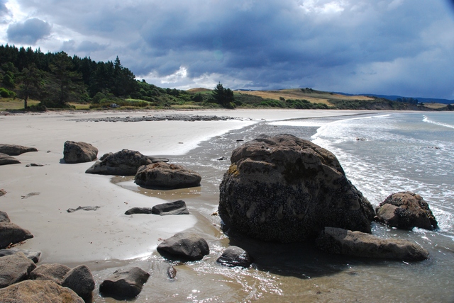 I znowu leje i w gębę wieje. Nie chcemy ugrzęznąć w Oamaru, ale też nie możemy przecież tak pochopnie przerwać RE-GE-NE-RAC-JI. W związku z tym oszukujemy po raz drugi: pakujemy rowery do samochodu sąsiadów z campingu i teleportujemy się do uroczej nadmorskiej wioski Moeraki. Jedynie słuszna decyzja, bo wiatr taki, jak w drodze do Mt Cook.
