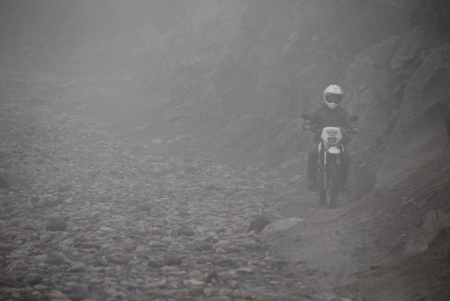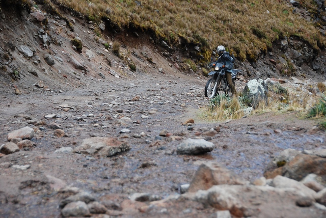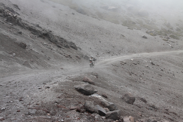 Na górę dojeżdżamy wieczorem w strugach deszczu. Do celu zostało jeszcze tylko kilka kilometrów, ale robi się coraz bardziej stromo, błoto, kamienie i nic nie widać. Przekładamy końcowy atak na następny dzień. Rozstawiamy namioty, szybko szybko, żeby jak najmniej zmokło! Przed nami rześka noc na 4200 m.