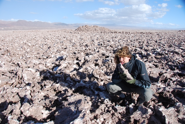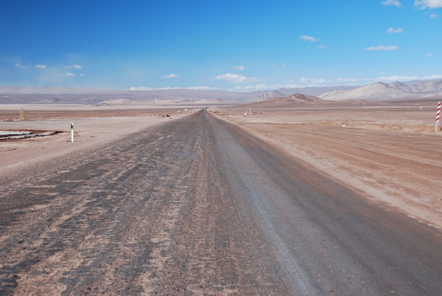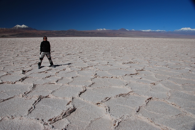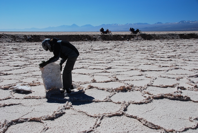 Słońce praży, gorąco, do tego wiatr wyjątkowo współpracuje, w ogóle nie czujemy prędkości.Po południu wjeżdżamy na salar. Wielka, otoczona górami płaszczyzna, na niej rozsiane kopalnie soli. Po obu stronach drogi zwariowane solne wzory. Mijamy sporo kopalnianych ciężarówek, ale na szczęście stopniowo ruch zamiera.