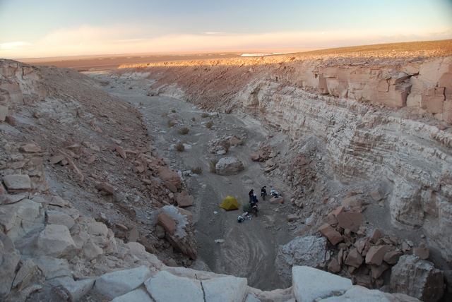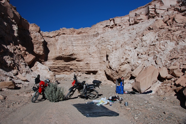 Powoli rozglądamy się za miejscem na nocleg. Widać jakieś kaniony. Tam czegoś poszukamy. Zjeżdżamy z drogi, kilometr tańczymy na piasku i zaschniętej glinie, aż wreszcie dojeżdżamy do końca kanionu. Idealne miejsce na kemping, osłonięci od wiatru, poza zasięgiem ludzkiego wzroku.