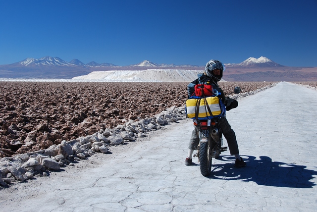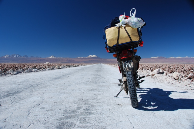 Jechaliśmy, jechaliśmy i wreszcie dojechaliśmy na legendarny Salar de Atacama. Motory zatankowane po brzegi, do tego po 4 litry benzyny w kanistrach i jeszcze na wszelki wypadek po 2 litry w plastikowych butelkach – tak, żeby jeździć, gdzie nas fantazja poniesie, zgubić się na kilka dni wśród soli, piasku, gór i lagun. Do naszego ekwipunku dokupujemy ciepłą kołdrę (prezent od rodziców z okazji dnia dziecka – dziękujemy!) i tak uzbrojeni ruszamy do walki z pustynną amplitudą.