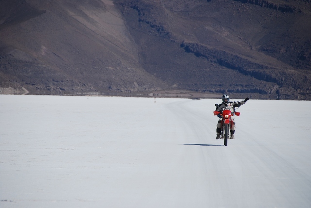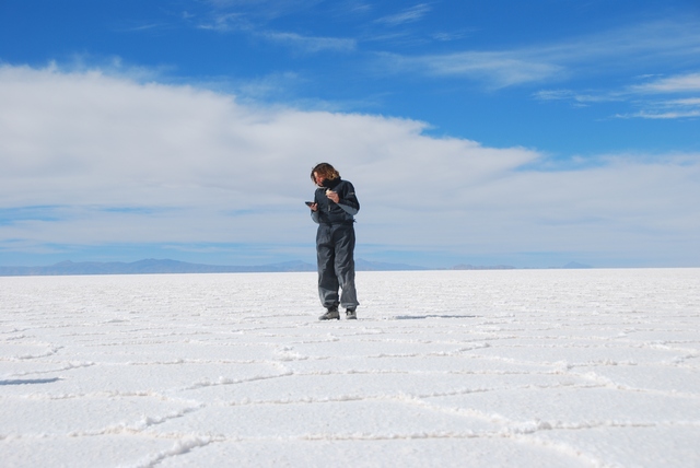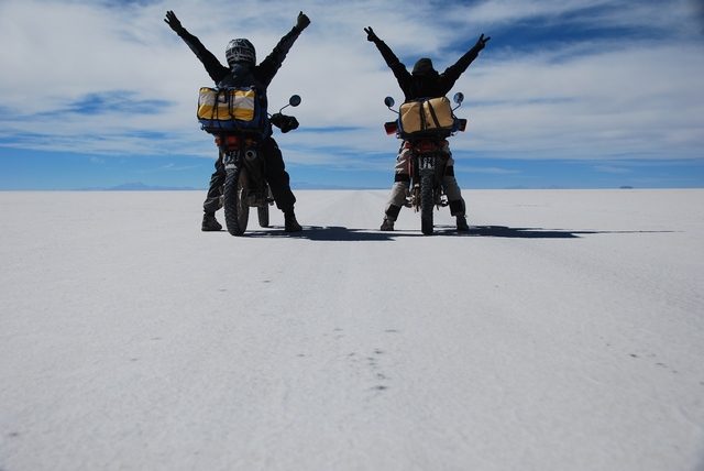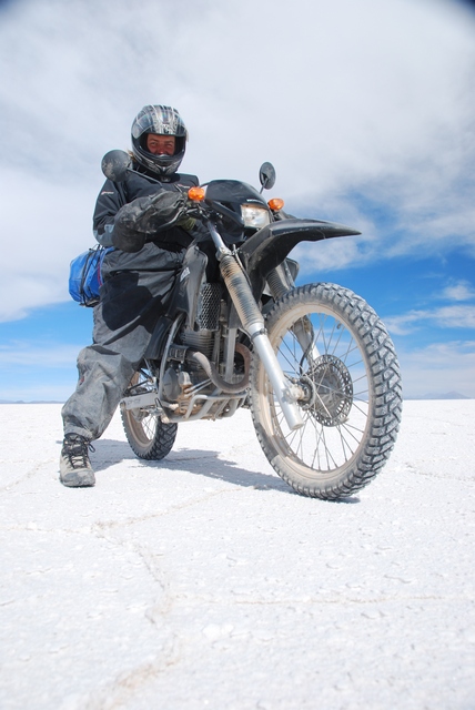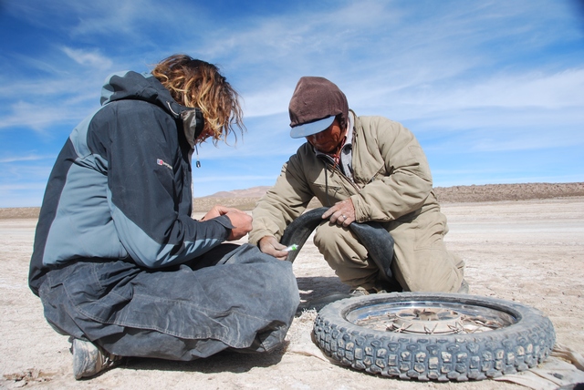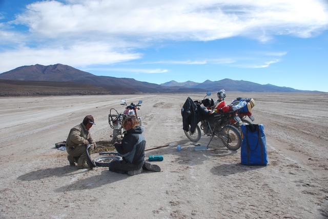 Przy wjeździe na Salar siedzi Boliwijczyk i dłubie w swojej Jawie. Podjeżdżamy sprawdzić, co się stało. Guma. Spełniamy dobry uczynek, dajemy panu naszą łatkę i pomagamy naprawić koło. Pan przeszczęśliwy, myślał, że będzie sterczał godzinami w szczerym słonym polu, a tu jak tylko zaczął zdejmować koło, zjawił się serwis