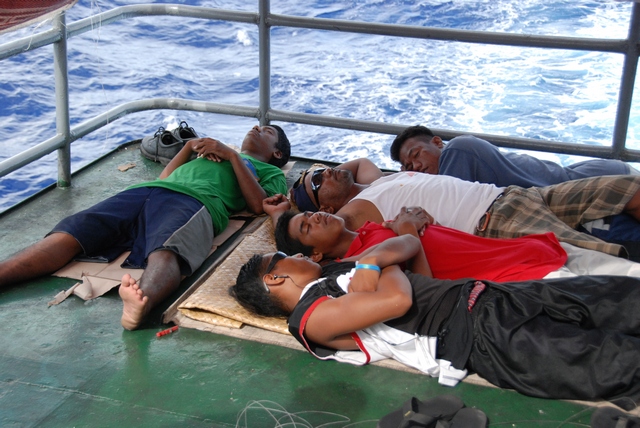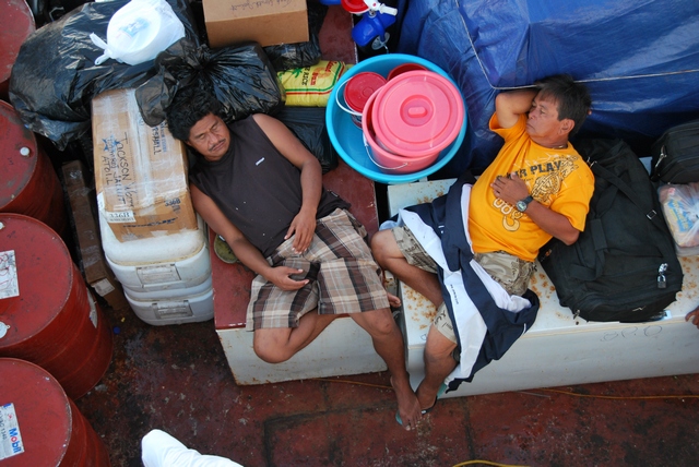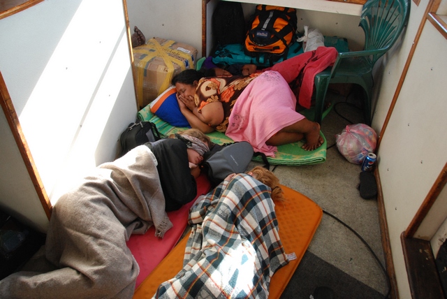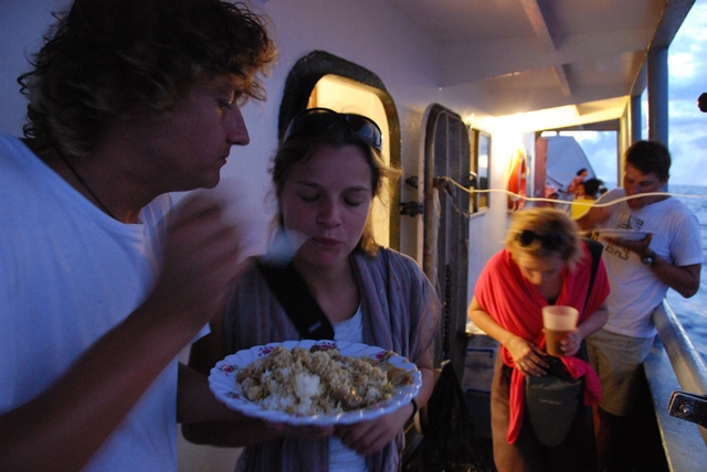 Ludzie porozkładali się po całym pokładzie statku. Każdy szuka skrawka powierzchni, na którym spędzi kolejne dziesiątki godzin rejsu. Wygląda to trochę jak obóz uchodźców. Kurczak zaczyna coraz mocniej dawać o sobie znać. Miesza się z zapachem paliwa… I tak przez długie godziny towarzyszy nam niezapomniany, unikalny wyziew ropokurczaka… Metodą drobnych kroczków zakładamy bazę na mostku kapitańskim. Jesteśmy trochę atrakcją, więc traktują nas w uprzywilejowany sposób. Co godzinę zapraszają nas na jedzenie…oczywiście w menu króluje kurczaczek