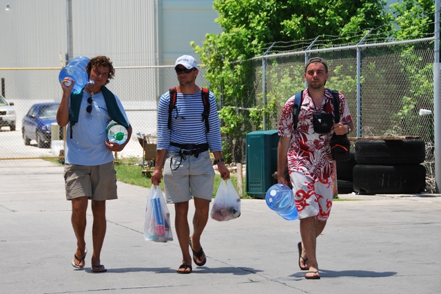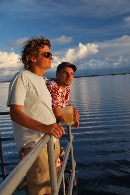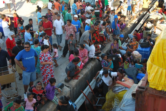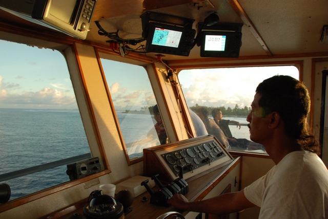 W poniedziałek rano dzwonimy do kapitana. „Przyjeżdżajcie, odpływamy!”. Stawiamy się w porcie. Statek ma płynąć przez Jaluit, Kili (tu najlepiej byłoby oglądać zaćmienie), Namdrik, Ebon i stamtąd po ok. 2 tygodniach powrócić na Majuro. Rejs opłacony jest przez Unię Europejską, a podstawowy cel to przewiezienie solarpaneli na atol Namdrik. Ale oczywiście przy okazji każdy chce zrobić swój mały biznes i zapakować na statek trochę dodatkowego towaru czy pasażera. W efekcie wokół statku kłębi się tłum kolorowy. Czekamy jeszcze wiele godzin, zanim wreszcie statek wypchany po brzegi ludźmi i towarem wszelakim, w tym kontenerami paliwa i mrożonych kurczaków drugiej świeżości, wypływa w morze.