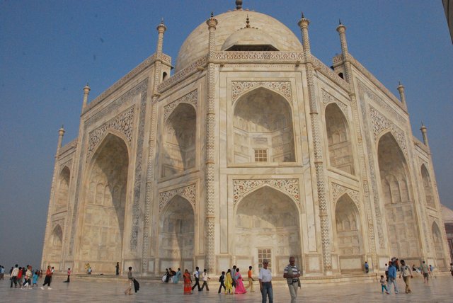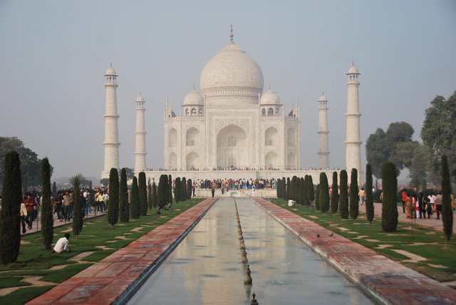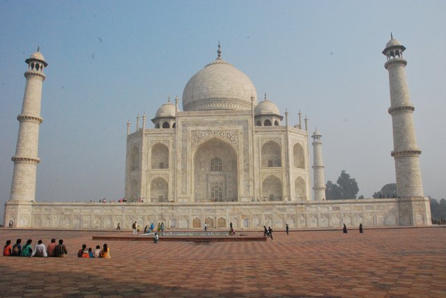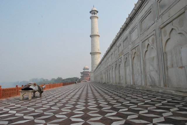 Mówili, że najlepiej obejrzeć Taj Mahal rano, bo wtedy jest najlepsza widoczność i mniej zwiedzających. Wstajemy w związku z tym tuż po wschodzie słońca, wyglądamy za okno, a tu mgła. Dopiero koło 10 nieco się polepszyło i mogliśmy zacząć zwiedzanie.