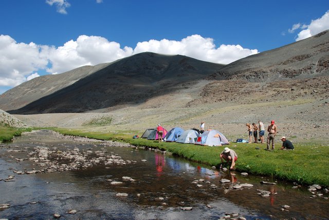 Noc chłodna, było pewnie koło zera. Słońce nie wschodzi, bo ustawiliśmy obóz blisko wzniesienia i pewnie do 10tej będziemy w cieniu. Teraz jest 6.30. Wstaję i budzę Pedra, bo umówiliśmy się, że idziemy na ryby. Wędki gotowe, wiec wyruszamy nad jezioro. Blachy na spiningach imponujące, rzucamy, rzucamy, przenosimy się dalej, znowu rzucamy – NIC. Obleźliśmy już pół jeziora – bez rezultatu. Daleko na koniu pojawia się postać. Parkuje rumaka jakieś 30m od nas. Okazuje się, że jest ich dwóch – ojciec i syn. Podchodzą do nas, witamy się. Tubylec wyciąga z wora duży żółty ser i kilka kostek twardego czegoś (chyba suszony ser z mleka jaka) i kanister świeżego mleka. Próbujemy się dogadać, idzie średnio. Pokazujemy na wędki i mówimy, że ryby niet. Pan ogląda nasze zestawy i szeroko się uśmiecha. Krzyczy coś do syna, syn biegiem leci po kamienie. Pan pokazuje nam, że pod niektórymi kamieniami są larwy owadów. Larwę taką trzeba oderwać od kamienia, usunąć osłonkę i zainstalować niedoszłego owada na haczyku. Jeszcze kilka kęsów sera, łyków pysznego mleka, częstujemy przybysza piwem, odwdzięczmy się kilkoma naszymi zanętami, żegnamy się. Lecimy do obozu przezbroić wędki. Spławiki haczyki, żyłka, wszystko elegancko. Zabieramy się za robotę i po około godzinie mamy obiad dla wszystkich.