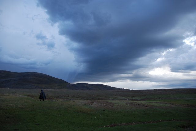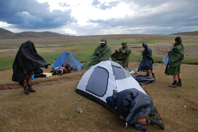 Po południu zwijamy obozowisko i w drogę. Plecaki są przeciążone, bo zabraliśmy zapas jedzenia na tydzień-dwa. Uznaliśmy, że na tym końcu świata nie ma co liczyć wyłącznie na organizowanie żarcia po drodze, poza tym jest nas za dużo, żeby ciągle obsępiać jurty. Dodatkowo Bart z Jackiem nastraszyli opowieściami o Kamczatce, kiedy musieli dzielić się na trzech jedną torebką ryżu na dzień, ho, ho, nie ma żartów, bo jak Polak głodny, to zły. Przechodzimy pierwszą przełęcz i dochodzimy do siedliska pagranców. Sprawdzanie paszportów i razrieszenia na pograniczną zonę, chłopaki jakby zdziwieni, że mamy wszystkie potrzebne papiery. Pewnie liczyli, że się trochę rozerwą, a tu nici. Idziemy dalej. Ostatnia przełęcz, widać jeziorko, nad którym zaplanowaliśmy nocleg. Nagle jak nie lunie. Zakładamy poncha i schodzimy w dolinę. Leje coraz gorzej, dookoła w górach walą pioruny. Czekamy, aż burza przejdzie, żeby rozbić namioty. No cóż, wszędzie podają, że to okres, kiedy w Mongolii spada największa ilość opadów. Na szczęście są krórkotrwałe. Póki co prawidłowość jest taka, że rano jest pękna pogoda, około południa pojawiają się chmury, gromadzą się przez kolejne godziny i ok. 15-16 zaczyna lać, a wieczorem znowu się przejaśnia. Nie wróży to najlepiej dla obserwacji zaćmienia słońca (wypada o 18tej), ale w życiu trzeba mieć szczęście, ostatnim razem w Ghanie też były fatalne prognozy, a się udało. Na chwilę przestaje lać. Rozstawiamy namioty, zaczynamy organizować kolację, ale ulewa wraca. Idziemy do namiotów, każdy zjada co ma pod ręką i spać.
